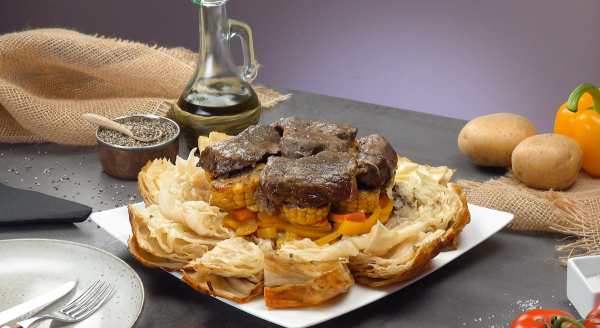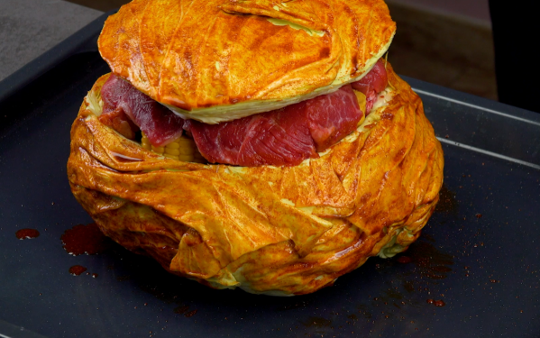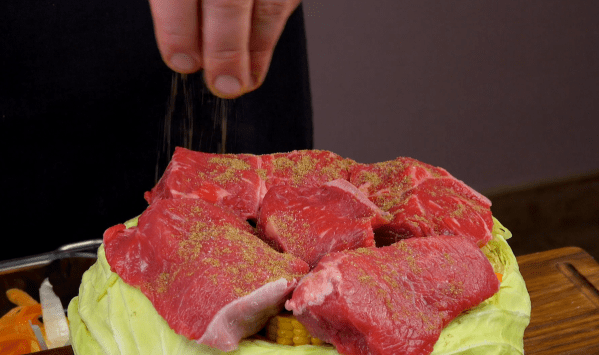 • Pour finir, mettez le bœuf coupé en tranches par-dessus. N'oubliez pas d'assaisonner cette couche également. Enfin, recouvrez le tout avec le morceau de chou qui a été coupé au début.