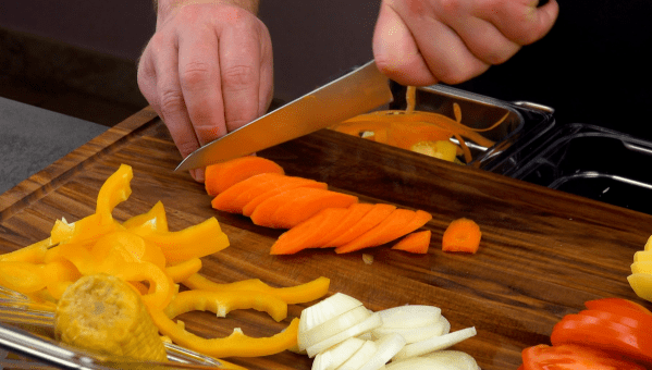 • Commencez par les pommes de terre, puis les tomates, les oignons, les poivrons, les carottes et enfin l'épi de maïs coupé en tranches.