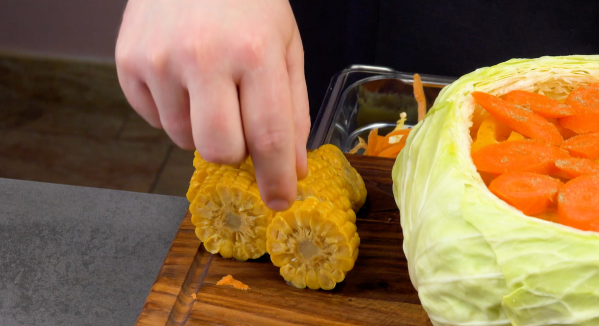 • Coupez les légumes en petits morceaux et commencez à les disposer en couches dans le chou. Il est important que chaque couche soit assaisonnée. Préparez un mélange d'épices composé de coriandre, de cumin, de poivre et de sel.