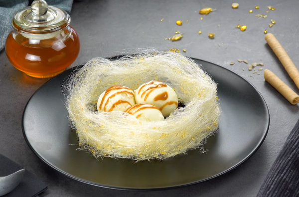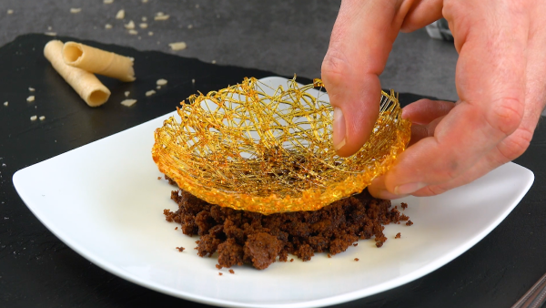 - Plongez le peigne dans le caramel liquide et agitez les fils fins de caramel sur une grande surface de travail en faisant des mouvements rapides. Pressez délicatement les fils de caramel ensemble et enroulez-les en forme de nid.