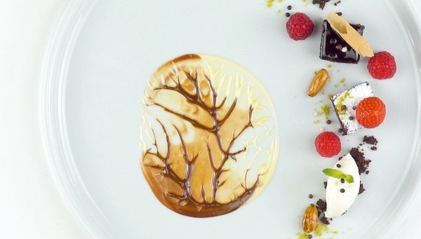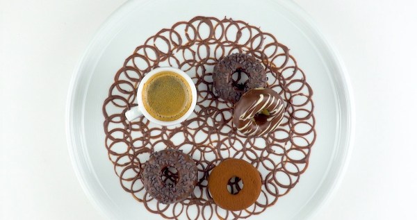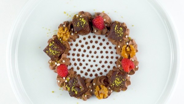 • Utilisez un bec verseur ou une forme similaire pour ce mandala. Plongez-le dans du chocolat noir fondu, puis pressez le bec (toujours recouvert de chocolat fondu) à plusieurs reprises sur l'assiette à décorer. Laissez les cercles durcir et l'assiette est prête pour la garniture.