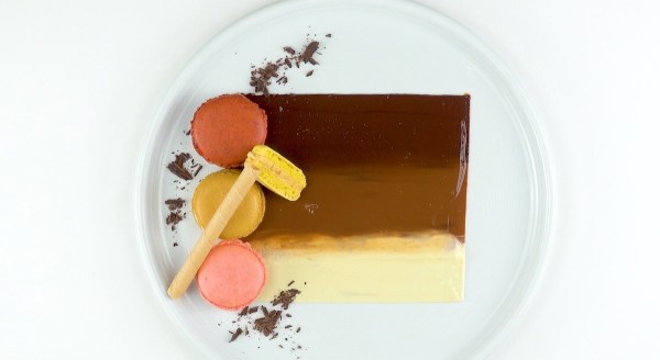 • Coupez le papier ciré en bandes et formez un rectangle sur une assiette préchauffée. Placez brièvement cette assiette au micro-ondes et réchauffez. Répartissez ensuite une bande de chocolat blanc, noir et au lait haché sur le rectangle de papier. Attendez que le chocolat ait fondu et étalez-le d'un côté à l'autre. Laissez le chocolat durcir un peu, puis retirez le papier ciré. L'assiette est prête à être garnie.