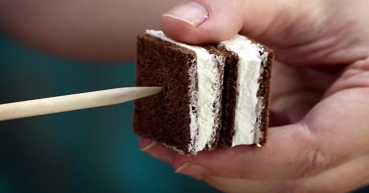 - Découpez vos quatre Kinder tranche au lait en douze cubes identiques. Empilez-les deux cubes l'un sur l'autre de façon à avoir six gros cubes puis plantez une pique en bois pour les maintenir ensemble.