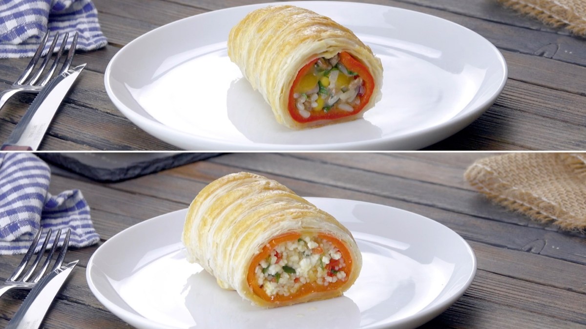 Aujourd’hui, Bon Ap’ vous propose deux variantes de poivrons farcis dans leur manteau feuilleté. C’est la farce qui fait toute la différence, regardez :