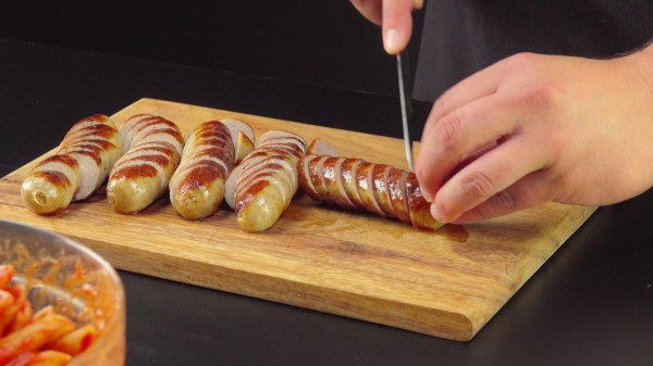 - Versez la sauce tomate sur les penne et mélangez bien le tout. Faites frire les saucisses et coupez-les en fines tranches.
