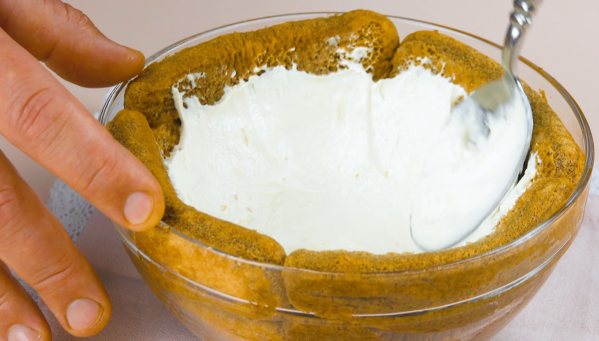 - Mélangez le mascarpone avec le sucre glace et la crème et fouettez le tout ensemble. Étalez une fine couche du mélange sur les boudoirs dans le saladier.
