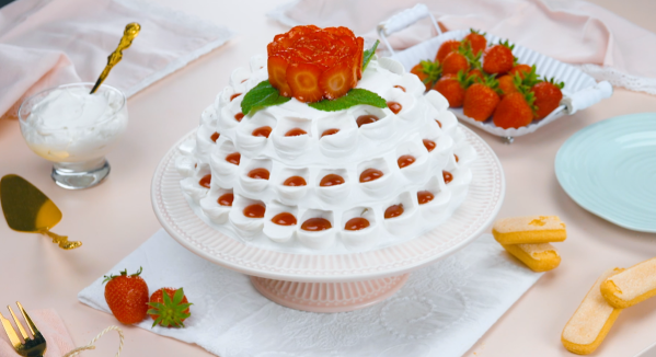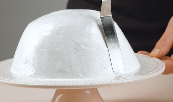 - Retournez le saladier pour démouler le dôme puis étalez la crème de mascarpone sur l'ensemble du gâteau. Utilisez une cuillère pour former des petits creux à intervalles réguliers et sur plusieurs lignes que vous décorez de coulis de fraise.