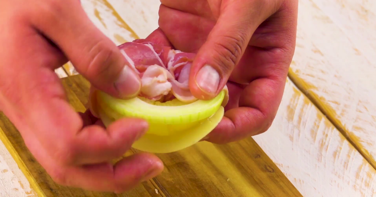- Enveloppez bien votre donut de fromage-ananas-oignon dans des tranches de bacon et faites revenir à la poêle jusqu’à ce que la viande soit bien croustillante.