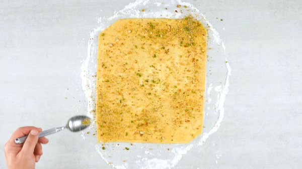 - Hachez environ la moitié des noix, des amandes et des pistaches et mélangez-les ensemble. Ensuite, étalez du beurre fondu sur la couche supérieure de la pâte et saupoudrez-la d'une petite quantité du mélange noix-amandes-pistaches hachées.