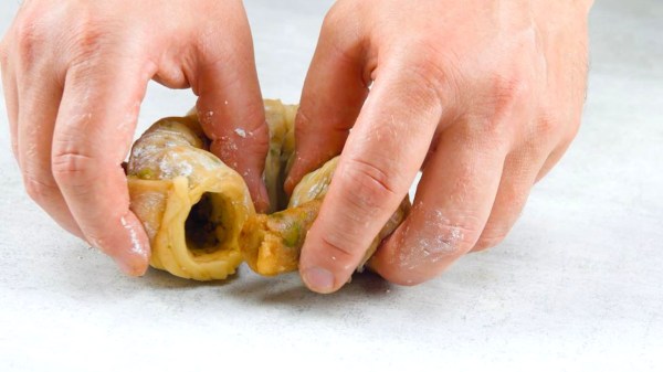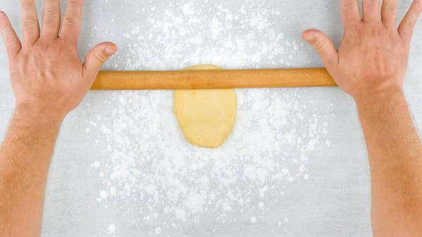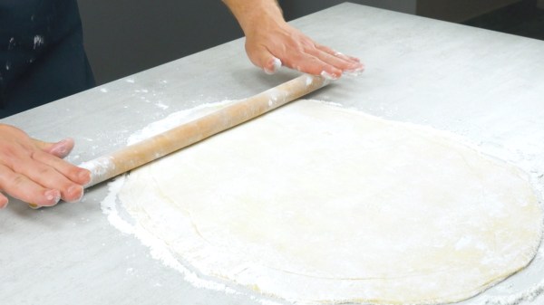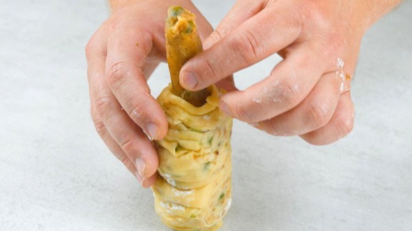 - Enroulez la couche de pâte sur votre rouleau à pâtisserie (il doit être fin). Pressez doucement la pâte vers le centre du rouleau à pâtisserie avec les deux mains, puis retirez-la délicatement de ce dernier. Répétez les dernières étapes avec les couches de pâte restantes jusqu'à ce que vous ayez 5 rouleaux de pâte compressés.