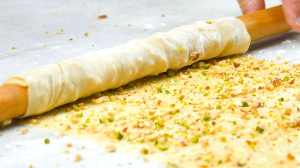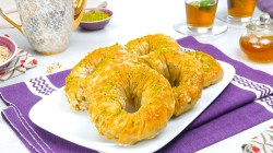 - Lorsque les donuts de baklava ont refroidi, recouvrez-les généreusement de miel, saupoudrez quelques pistaches hachées et laissez-les reposer à couvert pendant au moins 4 à 6 heures. Ils n'en seront que meilleurs.