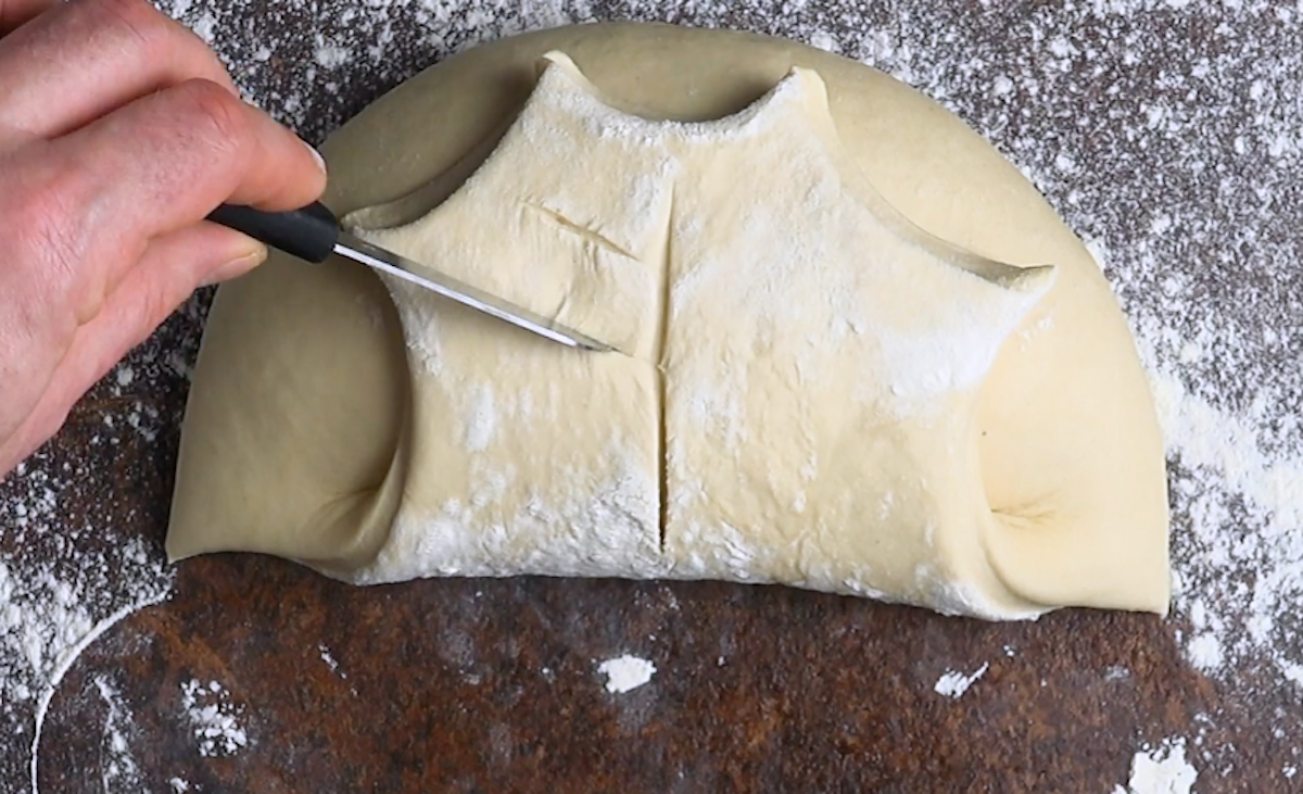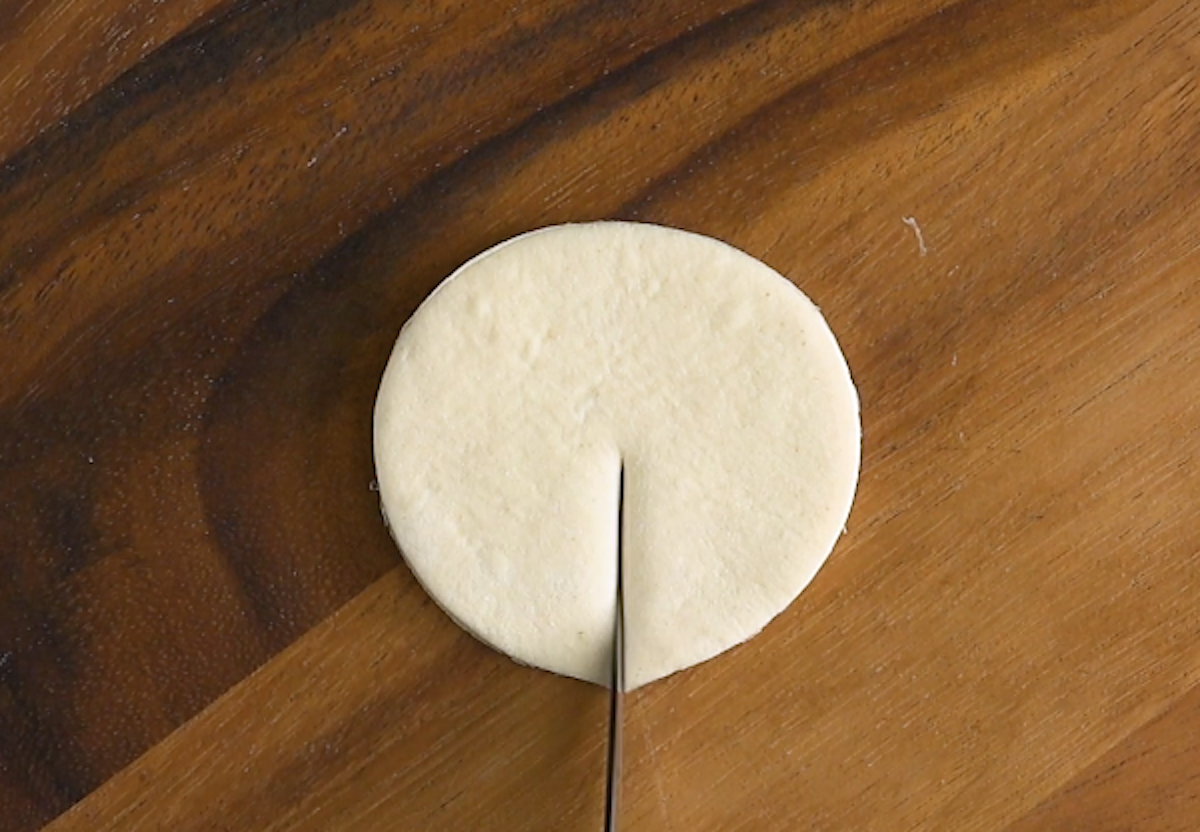 8.1) Découpez un cercle d’environ 7 à 8 cm de diamètre dans la pâte étalée. Faites deux incisions en bas et une en haut.