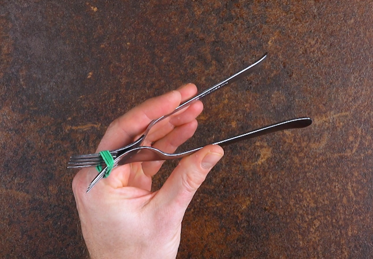 1.1) Formez une boule avec la pâte que vous aplatissez légèrement. Saupoudrez deux fourchettes de farine et attachez-les ensemble avec un élastique, comme montré ci-dessous.