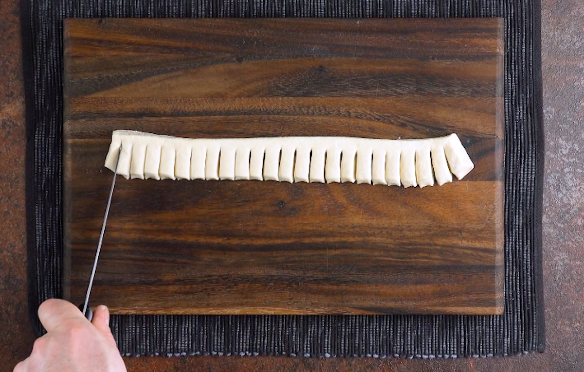 9.1) Coupez une bande de pâte (longueur 20 cm, hauteur 2 cm). Coupez la bande à intervalles réguliers avec un couteau.