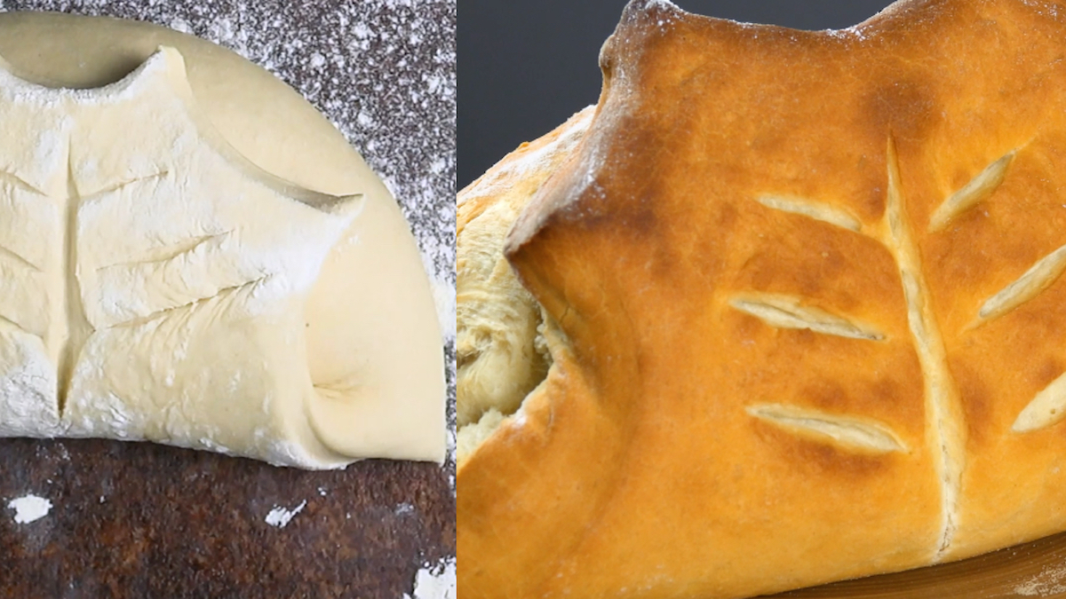 4.2) Repliez cette moitié de pâte vers le haut, sur la moitié déroulée. Créez les nervures des feuilles dans la pâte avec un couteau aiguisé.