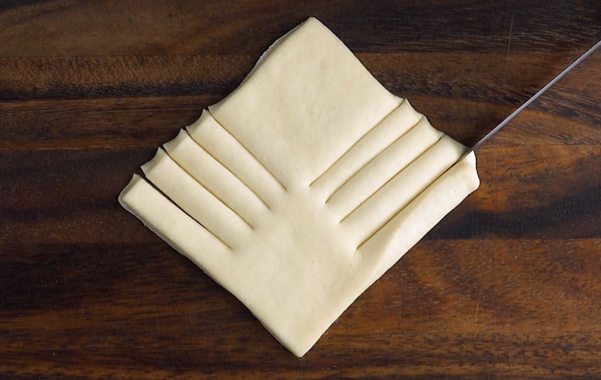 7.1) Découpez un carré de 10 par 10 cm dans la pâte étalée. Coupez la pâte quatre fois sur les deux faces, comme indiqué sur l’image suivante