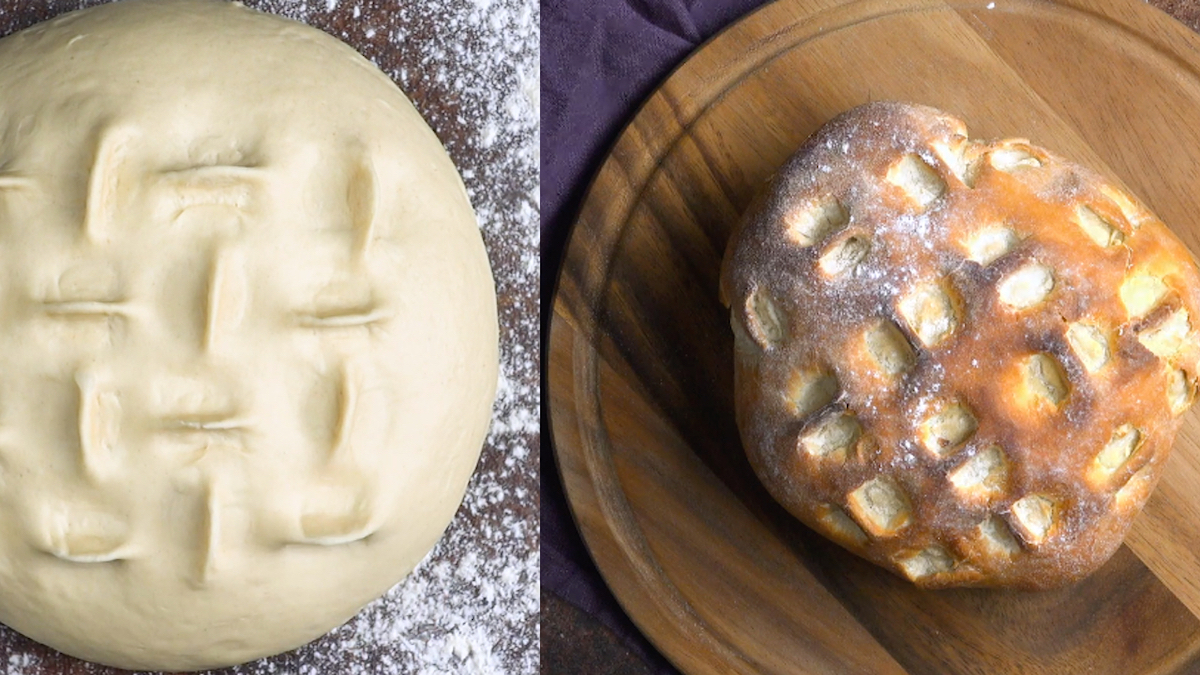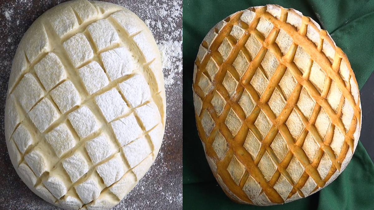 Donnez à la pâte une forme ovale et saupoudrez-la de farine. Ensuite, laissez-la lever pendant 30 minutes. Coupez le pain avec un couteau tranchant en diagonale de gauche à droite et de droite à gauche. De cette façon, vous obtenez un schéma quadrillé. Mettez le pain dans le four préchauffé et faites-le cuire à 250 °C à feu vif pendant 15 minutes. Réduisez ensuite la température à 180 °C et faites cuire le pain pendant 30 minutes supplémentaires, à chaleur tournante. À la fin, le pain doit sonner creux.