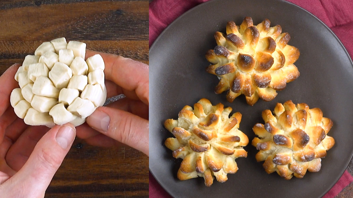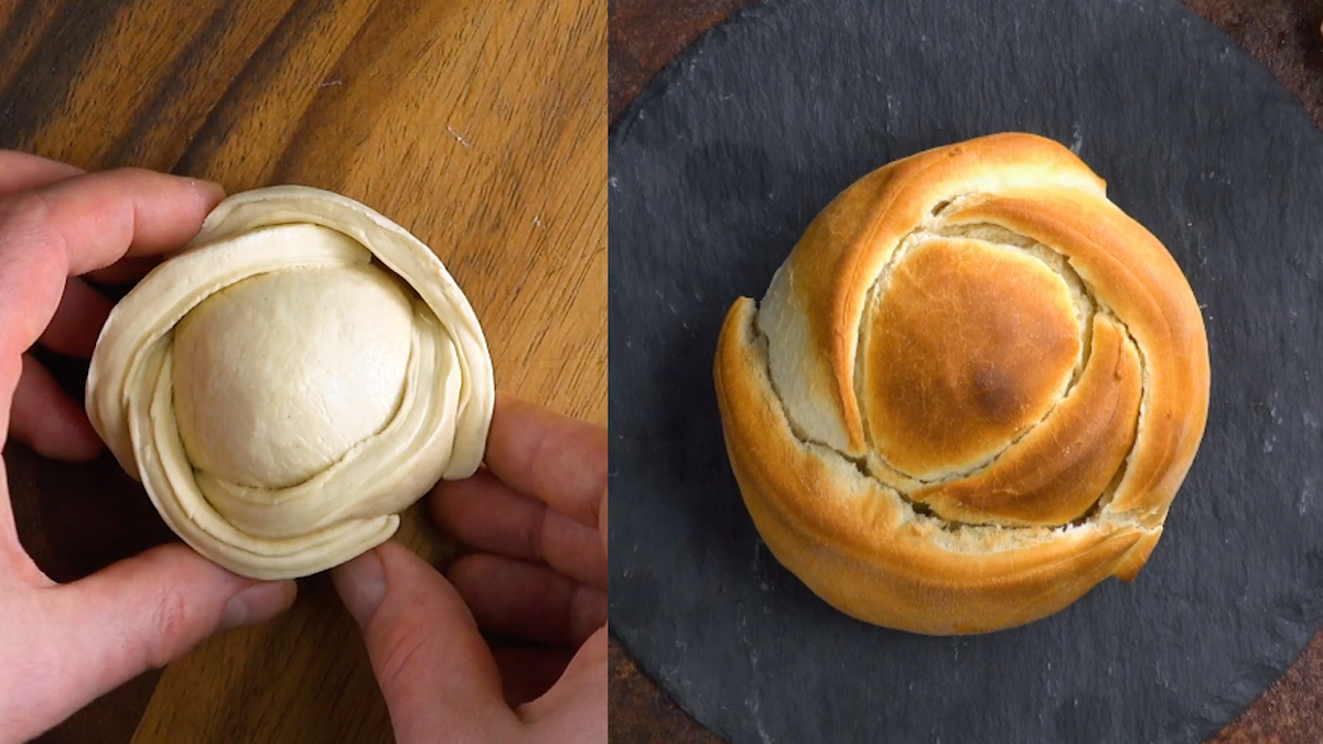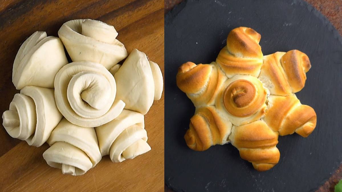 10.2) Placez une boule de pâte au milieu. Pliez les segments vers le haut pour que la pâte ressemble à une rose. Placez la rose dans le four à 250°C à feu vif pendant 15 minutes. Ensuite, baissez la température du four à 180 °C et faites cuire la rose pendant encore 20 minutes, à chaleur tournante.
