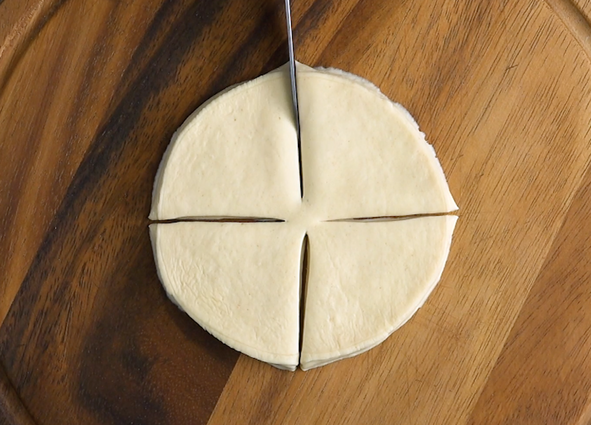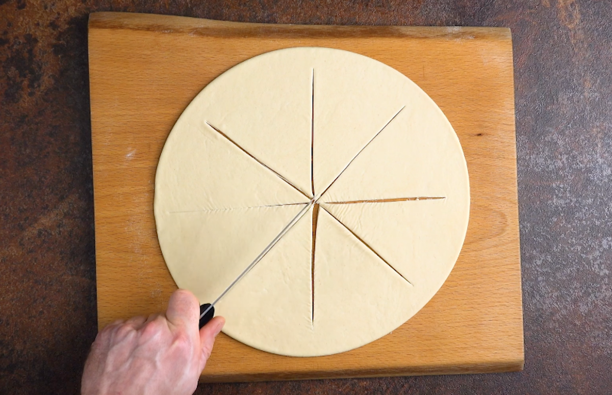10.1) Découpez un cercle d’environ 13 cm de diamètre dans la pâte étalée. Découpez le cercle de manière à ce que 4 segments de taille égale soient visibles.
