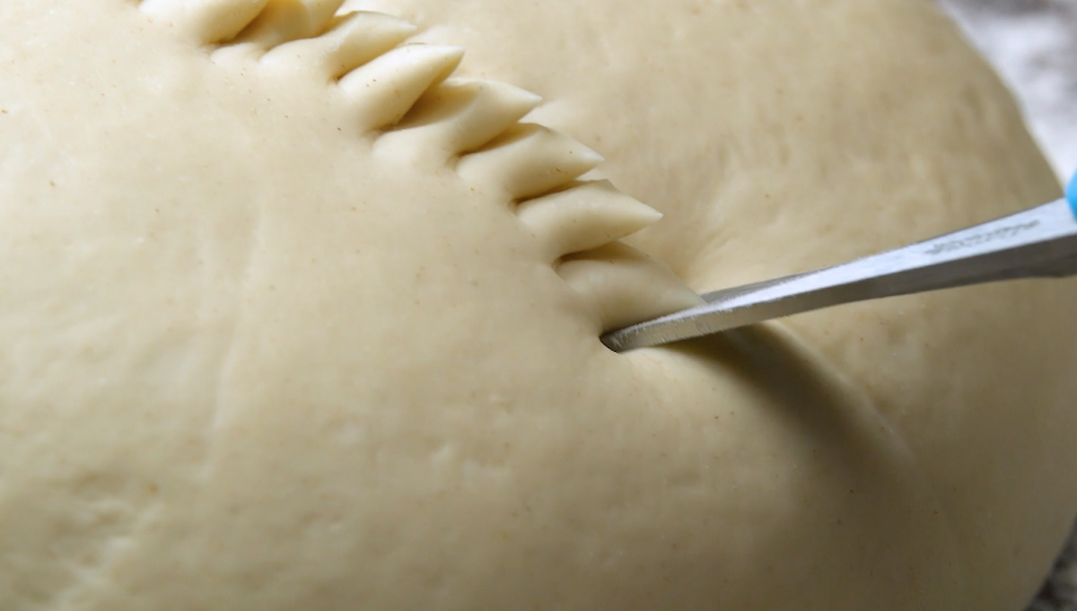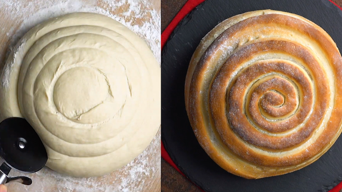 Formez une boule de pâte et coupez-la en spirale à l’aide d’un coupe-pizza ou d’un petit couteau. Mettez le pain dans le four préchauffé à 250°C et faites-le cuire pendant 15 minutes. Ensuite, baissez la température à 180°C et faites cuire le pain pendant 30 minutes supplémentaires, à chaleur tournante. À la fin, le pain doit sonner creux.