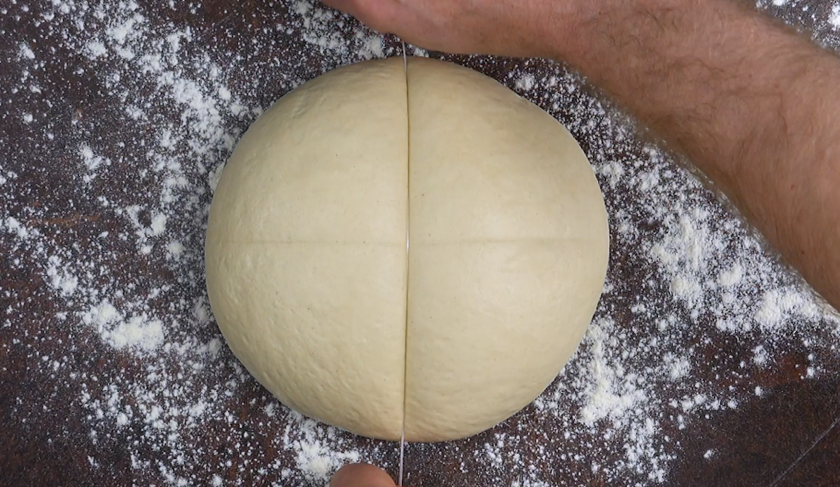 2.1) Formez une boule avec la pâte et “coupez-la en quatre” avec du fil dentaire. Appuyez légèrement dans la pâte pour ne voir que les lignes.