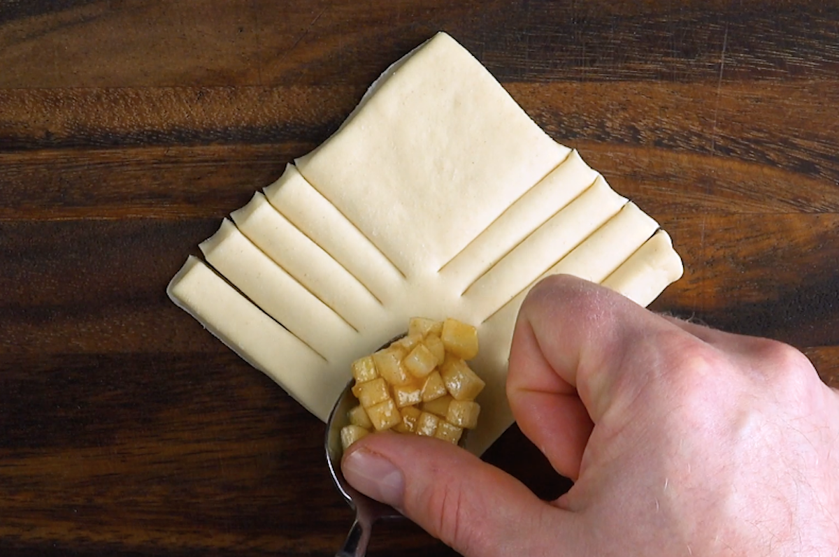 7.2) Mélangez les cubes de pommes avec de la cannelle et de la compote de pommes. Ensuite, placez 1 cuillère à soupe de cubes de pommes sur la moitié inférieure du carré.