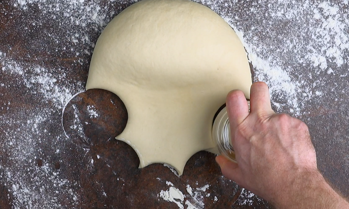 4.1) Formez une boule de pâte et étalez-la du centre vers le bas avec un rouleau à pâtisserie. Découpez la surface de la pâte étalée avec un verre de manière à créer une forme de feuille.