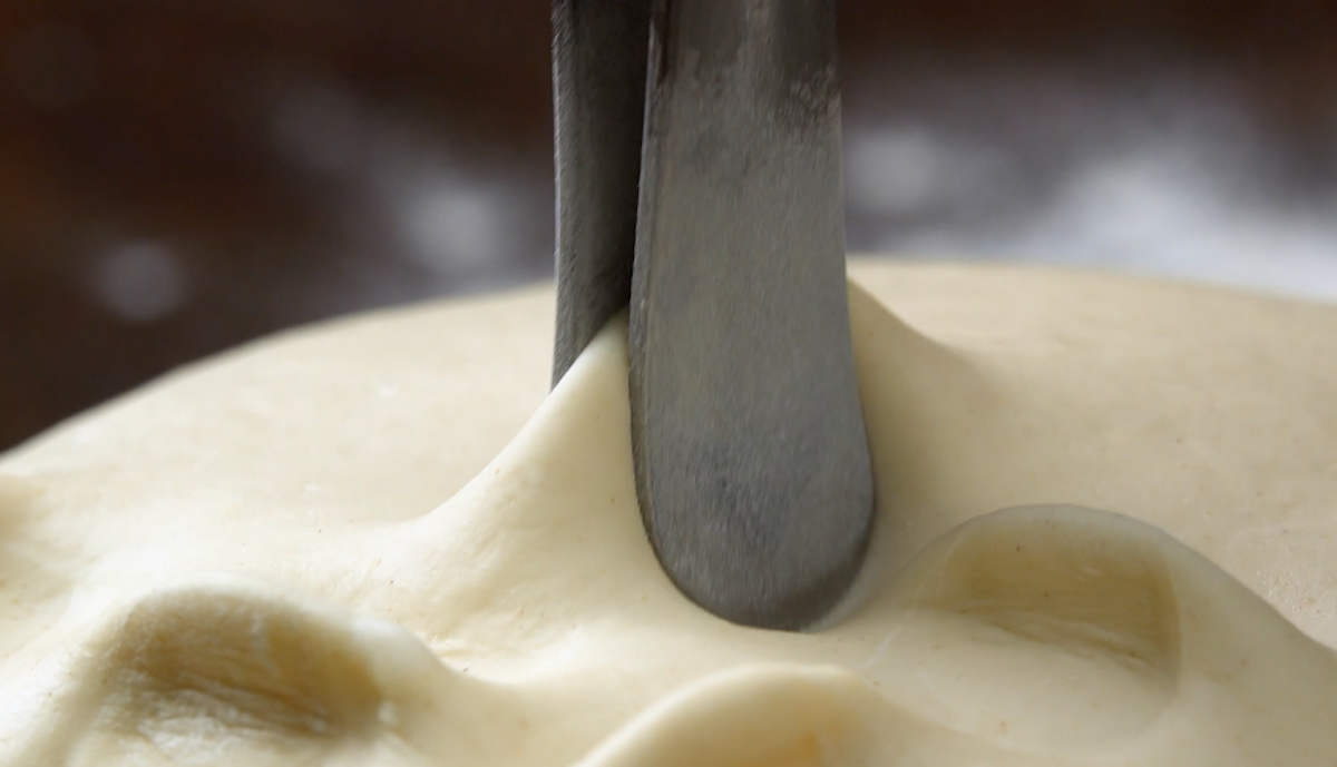 1.2) Ensuite, tirez la pâte vers le haut à plusieurs endroits en utilisant les fourchettes afin de former un motif régulier.