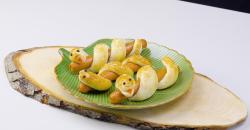2. Saupoudrez maintenant la pâte de parmesan et mettez deux grains de poivre pour faire les yeux sur l'une de ses extrémités. En dessous, faites une incision et insérez un petit morceau de poivron rouge pour représenter la langue.