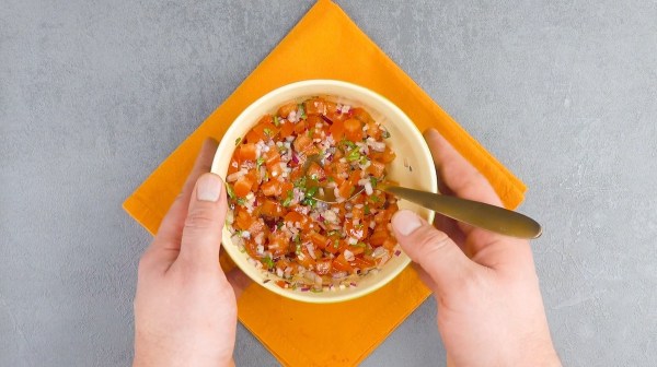 • Mélangez les tomates, les oignons, l'ail, le basilic et l'huile et assaisonnez avec du sel et du poivre.