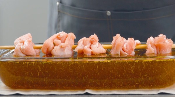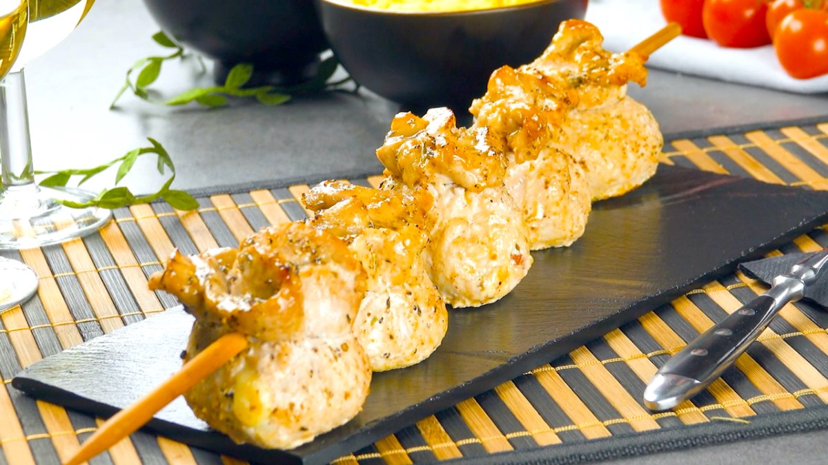 • Plantez les paquets d'escalopes de porc l'un après l'autre sur une brochette en bois.