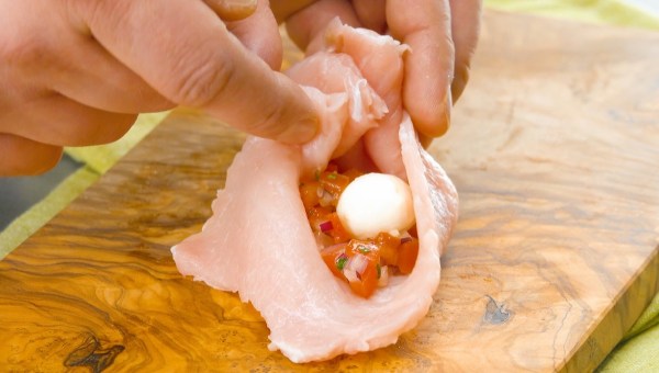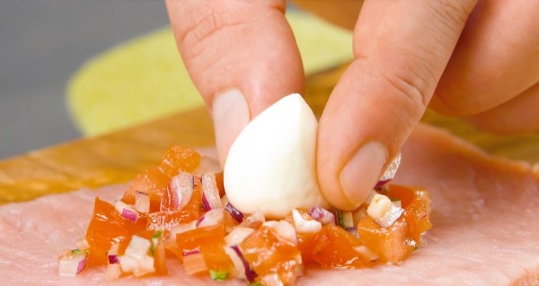 • Placez une cuillère à soupe de bruschetta au centre de chaque escalope de porc et recouvrez chacune d'une petite boule de mozzarella.