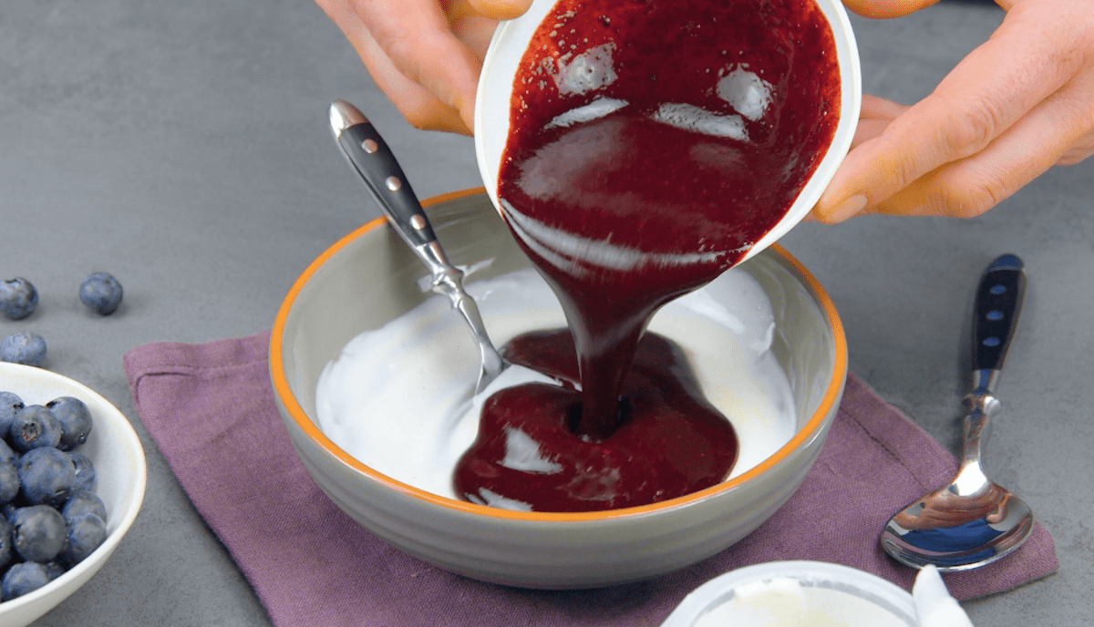 2.2 Mélangez le reste du yogourt à la purée de myrtilles. Versez ensuite le tout également dans le pot de yaourt.