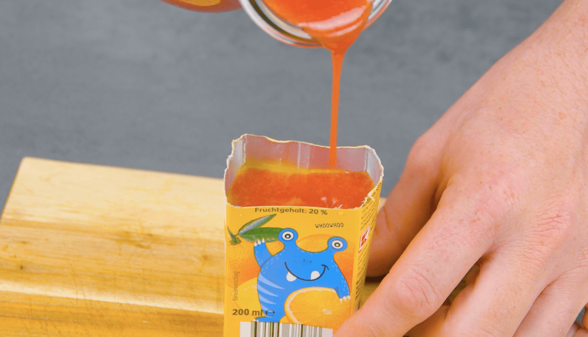 3.2 Remplissez la brique de purée de mangue, puis de purée de framboises. Introduisez ensuite la paille dans la purée.