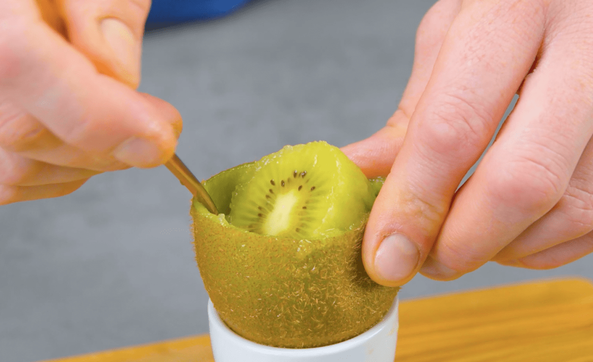 1.1 Coupez la partie supérieure du kiwi et évidez le fruit restant à l’aide d’une cuillère.