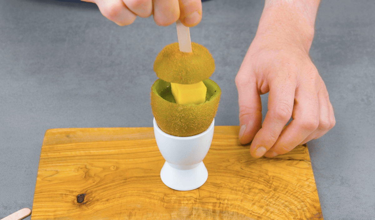 1.3. Remplissez à nouveau la purée aux trois quarts dans le kiwi évidé, passez un bâtonnet en bois à travers le “couvercle” du fruit coupé au début ainsi qu’à travers un cube de mangue et enfoncez-le ensuite dans le kiwi rempli de purée.