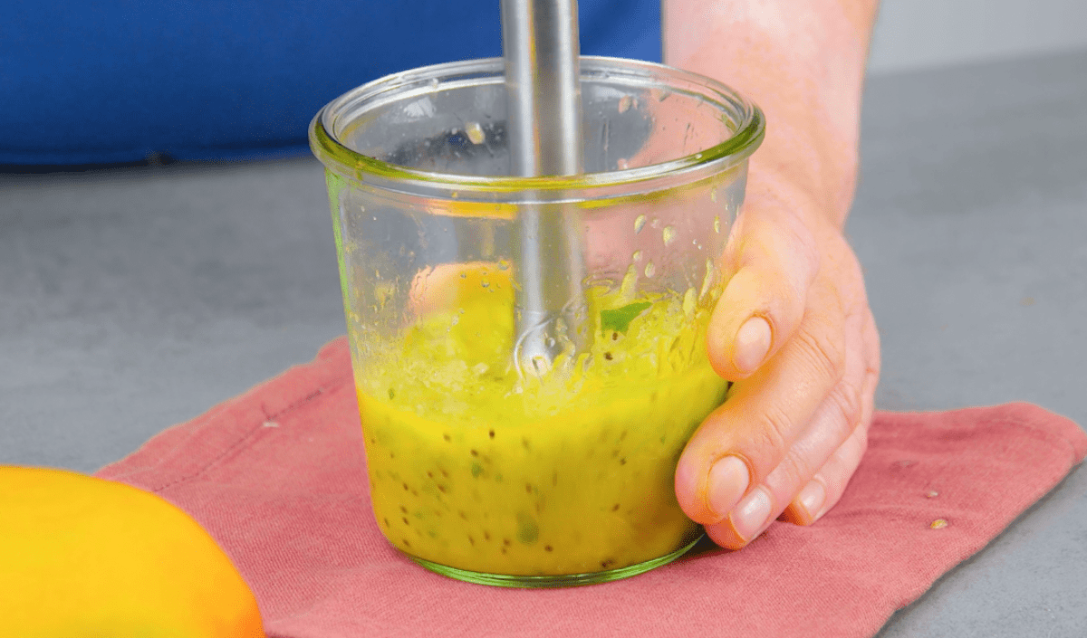 1.2 Mettez la chair dans un bol avec les cubes de mangue, le basilic et le miel et mixez le tout.