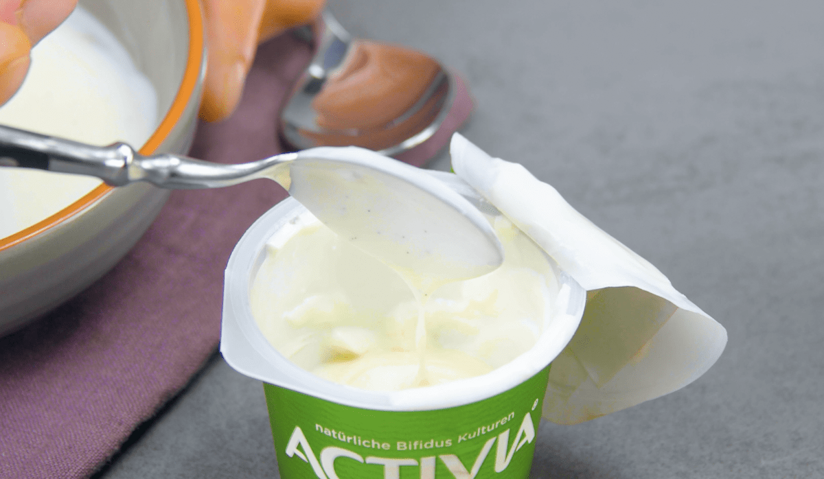 2.1 Mettez le yaourt nature dans un bol et mélangez-le avec le sirop d’agave et l’arôme vanille. Remettez la moitié du mélange dans le pot de yaourt.