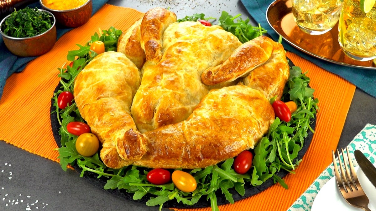 - Retirez le film alimentaire du corps du poulet congelé. Placez-le sur un rouleau de pâte feuilletée étalée et recouvrez-la d'une autre pâte feuilletée, en appuyant sur la pâte, en repliant les bords et en coupant l'excédent de pâte. Badigeonnez la viande hachée congelée d'un œuf battu pour que la pâte feuilletée y adhère mieux.Suivez le même principe pour envelopper les cuisses, en utilisant une pâte feuilletée par cuisse. Découpez deux triangles allongés dans la dernière pâte feuilletée pour chaque aile et enveloppez-les avec. Placez les ailes sur le plateau avec le reste du poulet.