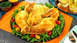 Servi sur un lit de salade verte, le poulet enveloppé de pâte feuilletée fait une excellente impression au premier coup d’œil. Cela se confirme également en le mangeant, car la garniture de purée de patates douces et d’épinards se marie extrêmement bien avec le poulet haché et la pâte feuilletée croustillante ; arrosé d’une sauce brune, le plaisir est total ! Bon Ap’ !