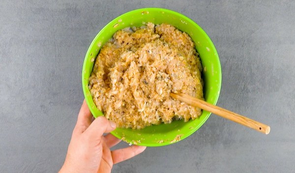 - Pétrissez le hachis de poulet avec deux œufs, le ketchup, la sauce Worcestershire, le sel et le poivre ainsi que le mélange de champignons et la chapelure.
