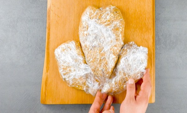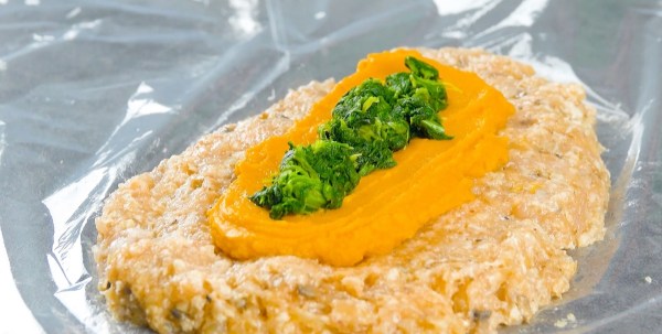 - Pressez 250 g du mélange de hachis sur du film alimentaire et répartissez 2 cuillères à soupe de purée de patates douces et quelques feuilles d'épinards au milieu. Recouvrez à nouveau les épinards de 2 cuillères à soupe de purée de patates douces et cachez le tout sous 250 g supplémentaires de mélange de viande hachée. Donnez au mélange farci la forme d'un corps de poulet et enveloppez-le dans du film alimentaire. Placez ensuite le paquet dans le congélateur pendant 1 heure.