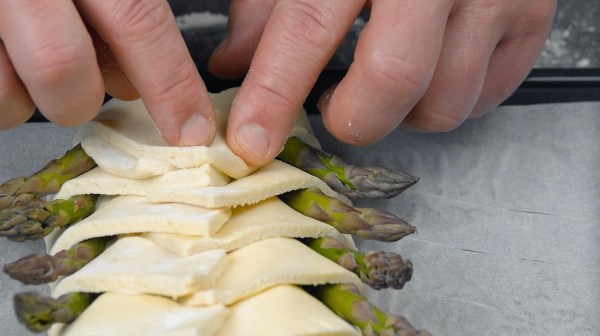 • Coupez les pointes d'asperges à la bonne taille (6 à 8 cm de long). Pliez la pâte en plaçant une pointe d'asperge de chaque côté de la feta de manière à ce que les pointes dépassent de la pâte.