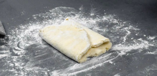 • Pétrissez la farine, le yaourt, le sel et le beurre pour la pâte. Si le beurre congelé est trop dur, vous pouvez encore couper les morceaux avec une râpe ou un couteau. Pliez chaque extrémité de la pâte vers le milieu, enveloppez-la dans du film alimentaire et mettez-la au frais pendant 45 minutes.