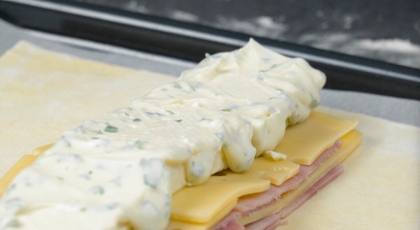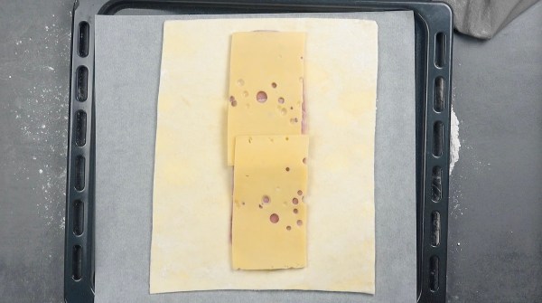 • Aplatissez la pâte et découpez-la en forme de rectangle. Ensuite, étalez la moutarde de Dijon au centre, recouvrez-la d'une couche de jambon, puis d'une couche de tranches de fromage.
