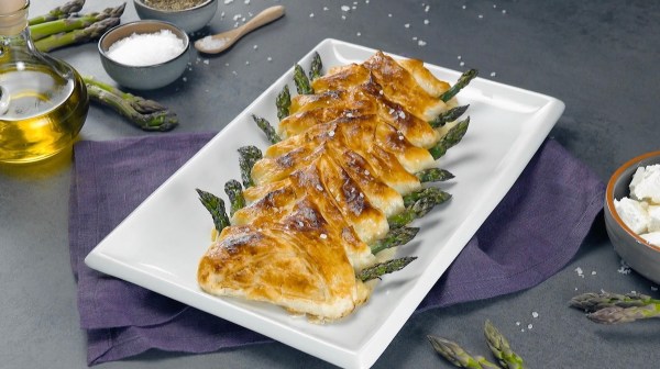 Il y a tant de bonnes choses avec des asperges, que ce soit en ragoût, avec des pommes de terre et de la sauce hollandaise ou en salade. Si vous pensez connaître toutes les façons de préparer les asperges, détrompez-vous car nous allons vous proposer quelque chose d’inédit : une pâte feuilletée garnie de jambon, de fromage, de feta et de sauce aux fines herbes qui laisse apparaître de délicieuses pointes d’asperges.