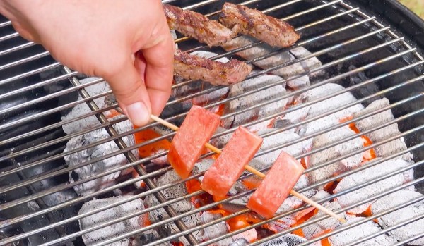 - Plantez les morceaux de pastèque sur la brochette en bois, mélangez le beurre fondu avec le sucre et enduisez la brochette avec. Faites griller les morceaux de pastèque marinés avec les morceaux de rumsteck des deux côtés, puis laissez-les refroidir brièvement.