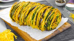 • Posez les tagliatelles cuites et les lamelles de légumes sur un film alimentaire dans le sens de la longueur. Versez la pâte d'épinards dans une poche à douille et répartissez-la uniformément sur les pâtes et les lamelles de légumes. Pour finir, posez également le filet de bœuf en travers et enroulez-le dans les pâtes.
