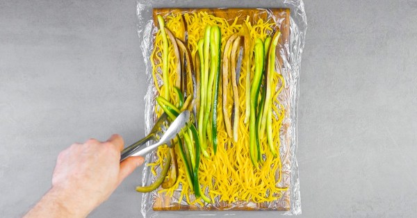 • Coupez les courgettes et les aubergines en deux et retirez la chair à l'aide d'une cuillère que vous réservez. Coupez les moitiés de légumes restantes en fines lamelles. Salez les lamelles de légumes et faites-les revenir dans la poêle. Laissez-les ensuite refroidir pendant environ 15 minutes. Faites revenir la chair réservée dans une poêle avec un peu d'huile d'olive et laissez-la refroidir pendant 15 minutes également.
