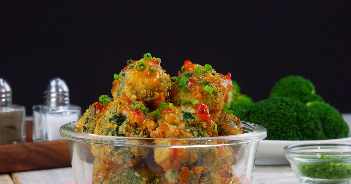 - Plongez les fleurs de brocoli dans la marinade à base de sauce chili, puis dans la chapelure et faites frire dans une poêle avec de l’huile bien chaude.